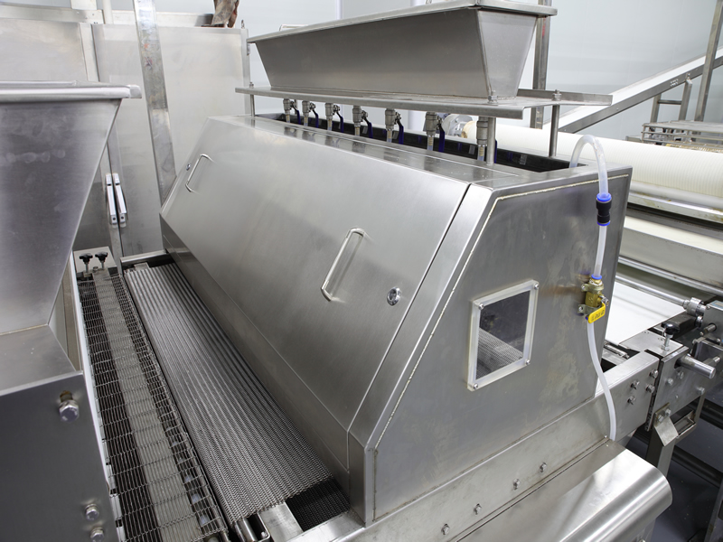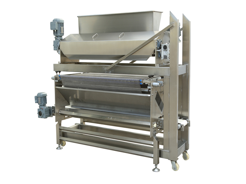 該設(shè)備應(yīng)用于將固體顆粒或者粉狀調(diào)味料,鹽,糖,芝麻及果仁片等撒布在面皮或則餅干上。回收機(jī)回收多余的撒布物料循環(huán)利用。