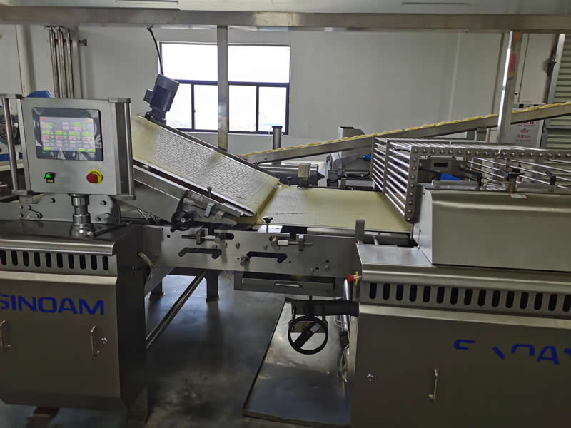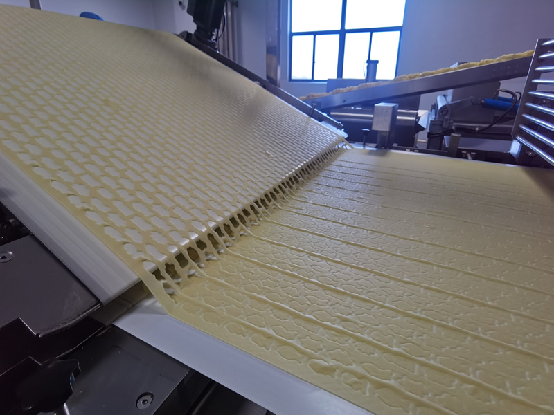 面皮成型后通過該設備將面皮與成型的餅干分離,分離后的面料經回收機回收到喂料機重復使用.采用側掛式電機減速機,線速度變頻可調,氣動張緊,氣動調偏; 分離刮刀可手輪升降(餅胚自動分離裝置),輸送帶方便更換,動力膠輥拆卸容易。